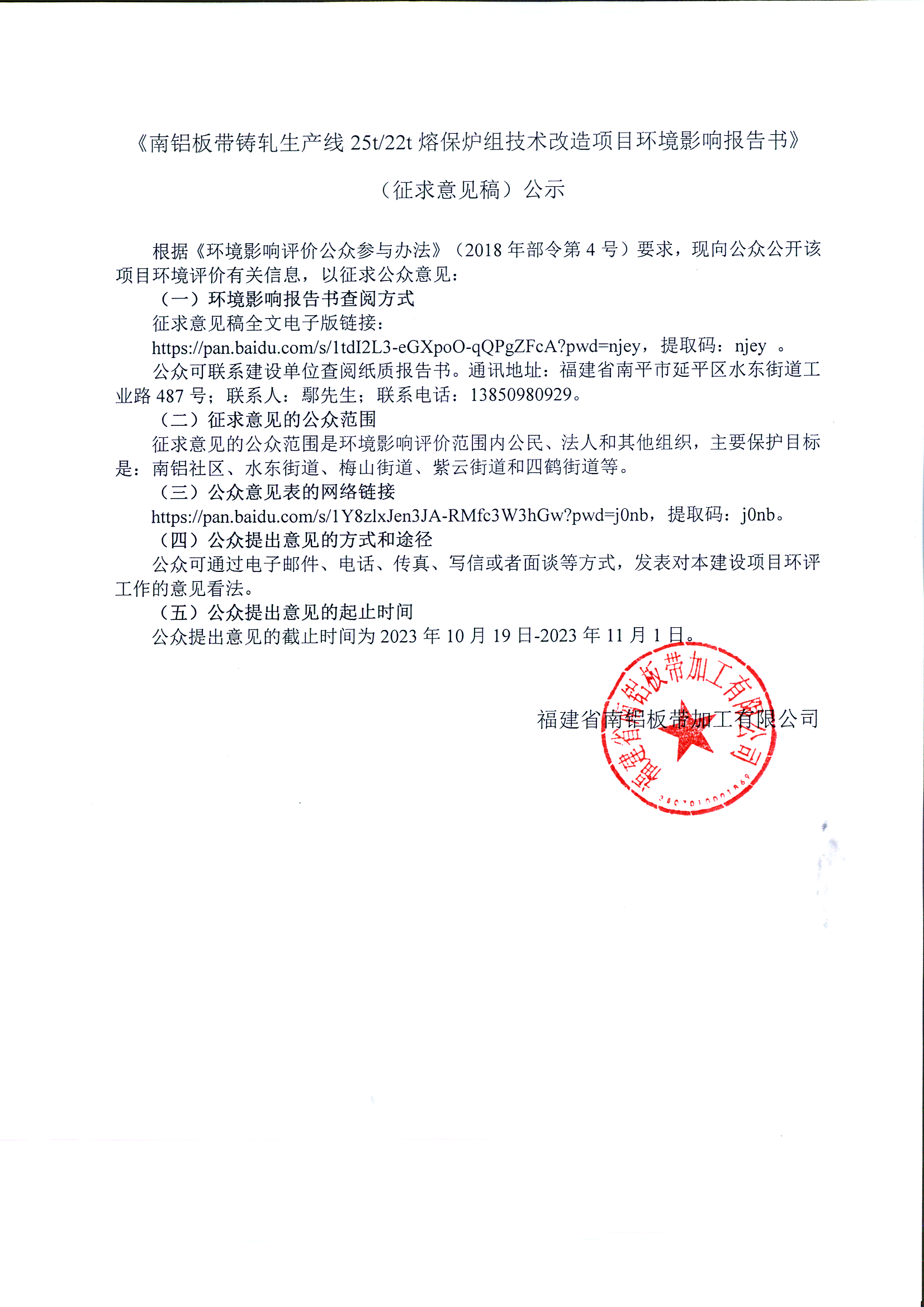 7.2023年排污許可證執(zhí)行報(bào)告 | 《南鋁板帶鑄軋生產(chǎn)線25t22t熔保爐組技術(shù)改造項(xiàng)目環(huán)境影響報(bào)告書》報(bào)批前公示 |